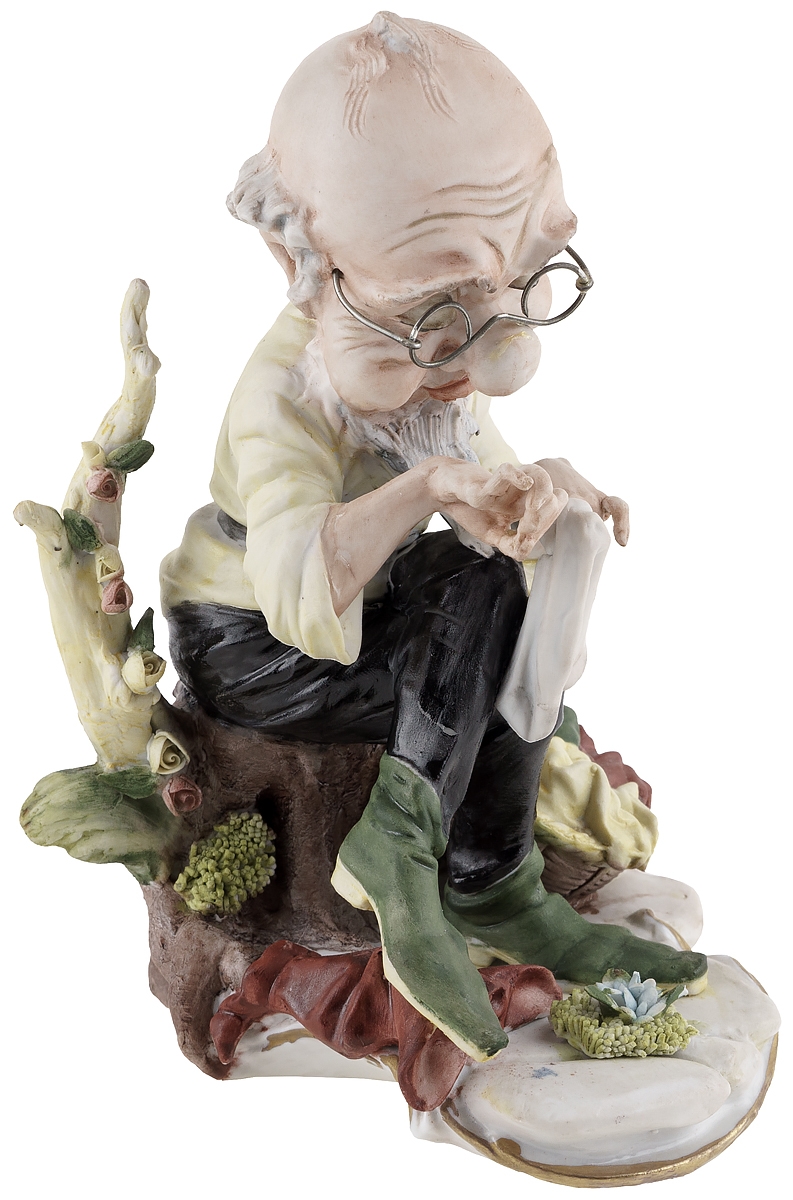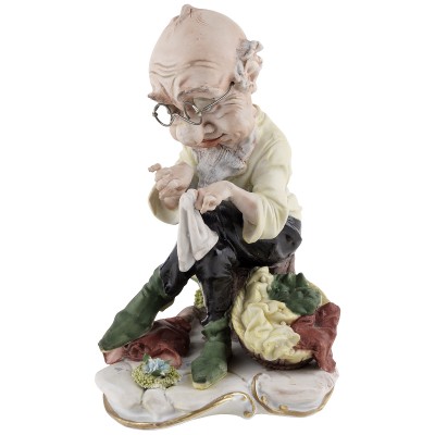 Великолепная жанровая статуэтка "Гном за починкой белья" знаменитой неаполитанской фабрики фарфора Capodimonte. Этот коллекционный фарфор, отличает тончайшая проработка мелких деталей и повышенное внимание авторов к жесту, позе и выражению лица персонажей.