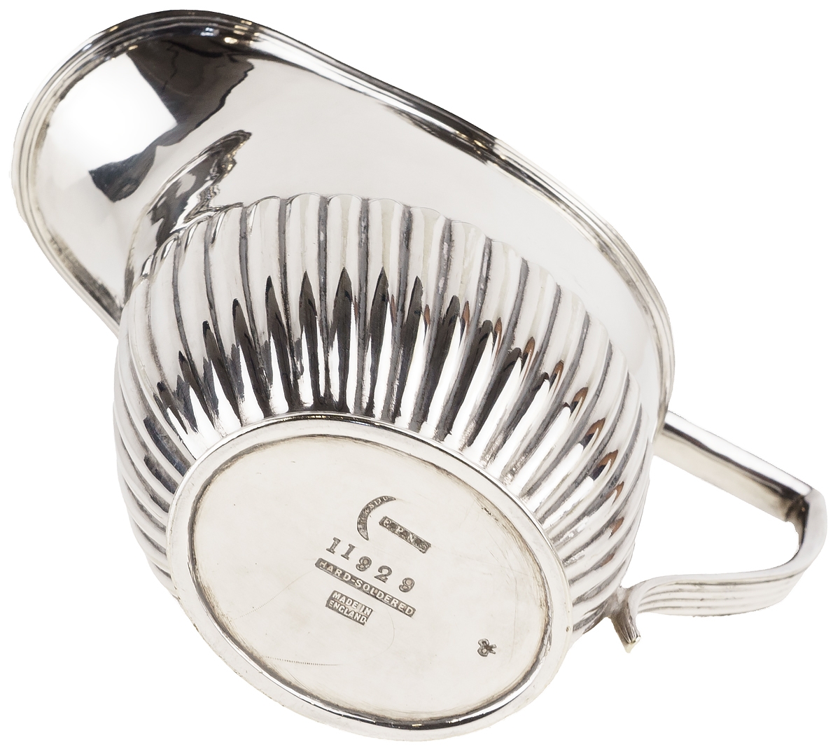 на молочнике: "Hard soldered. Made in England. EPNS"Сахарница: высота тулова 7 см, тулово 13 х 9 см.