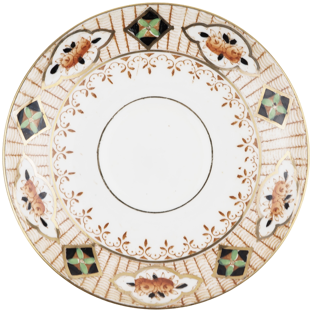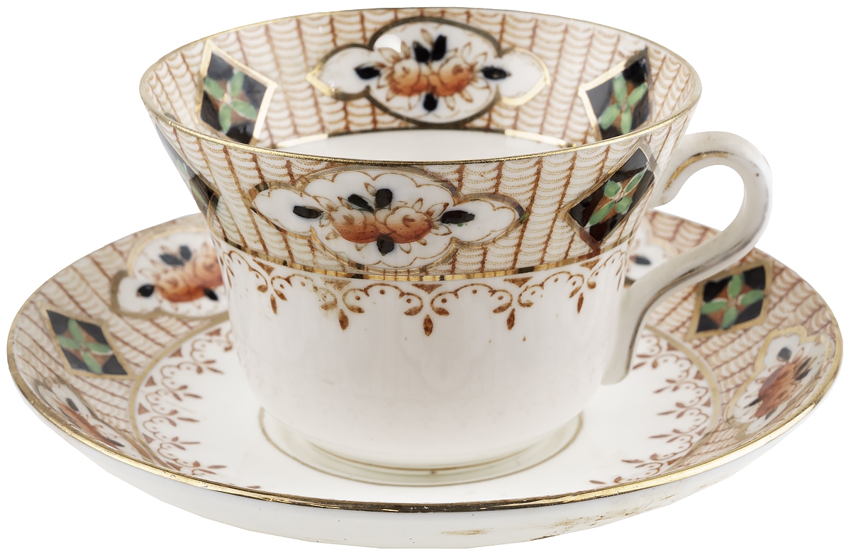 Сохранность удовлетворительная, чашка не звенит (есть внутренняя трещина), пара черных точек внутри чашки, потертость золочения в соответствии с возрастом.
