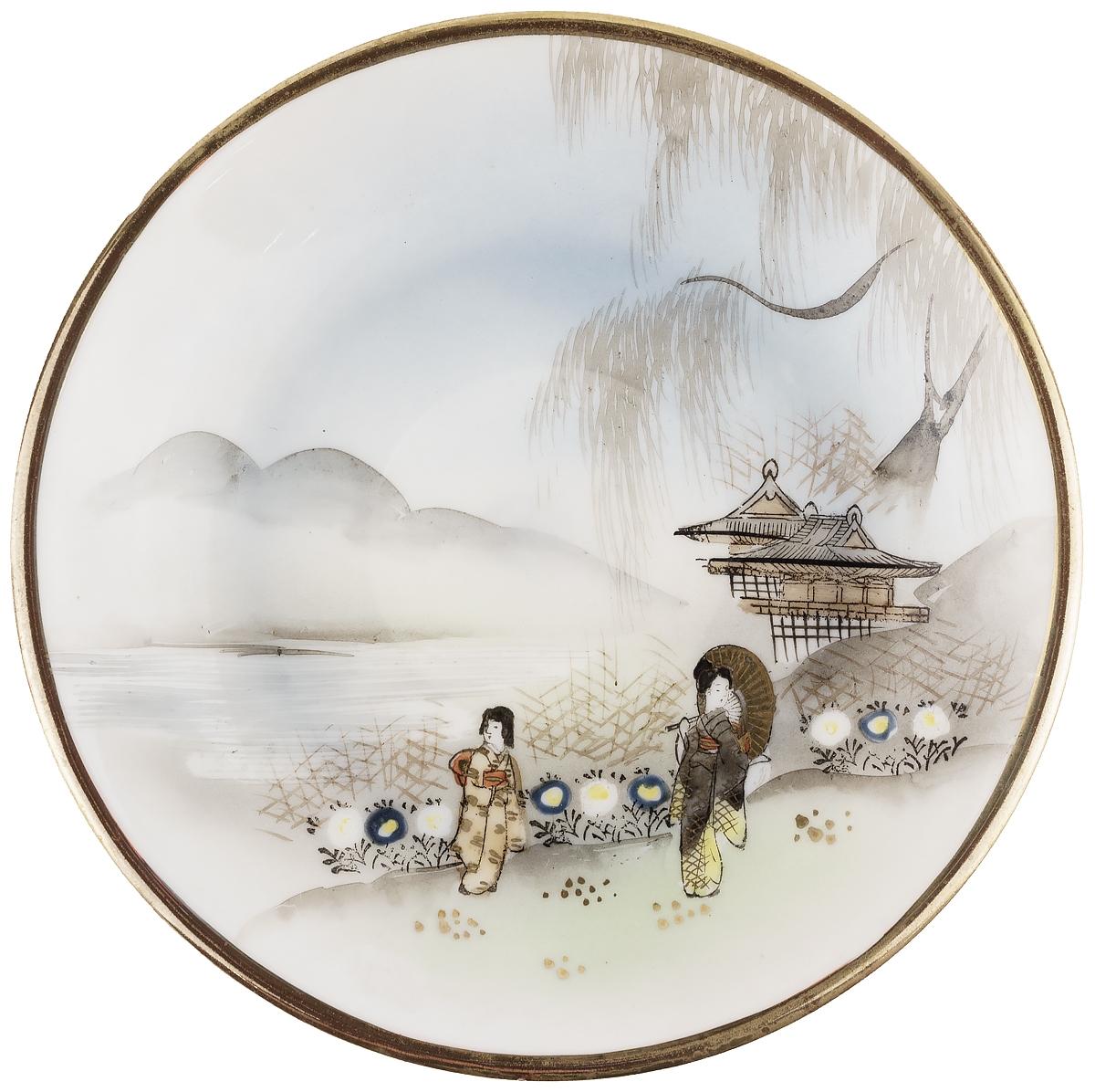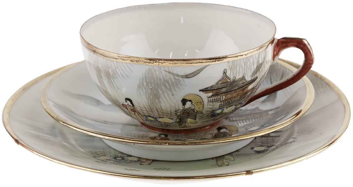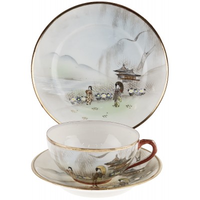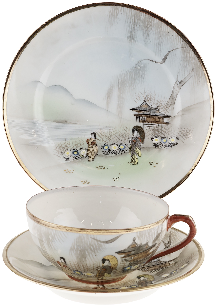 Чайное трио "Прогулка по саду". Фарфор, ручная роспись. Япония, винтаж, середина 20 века