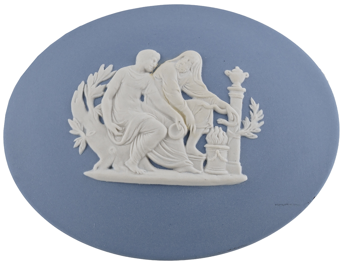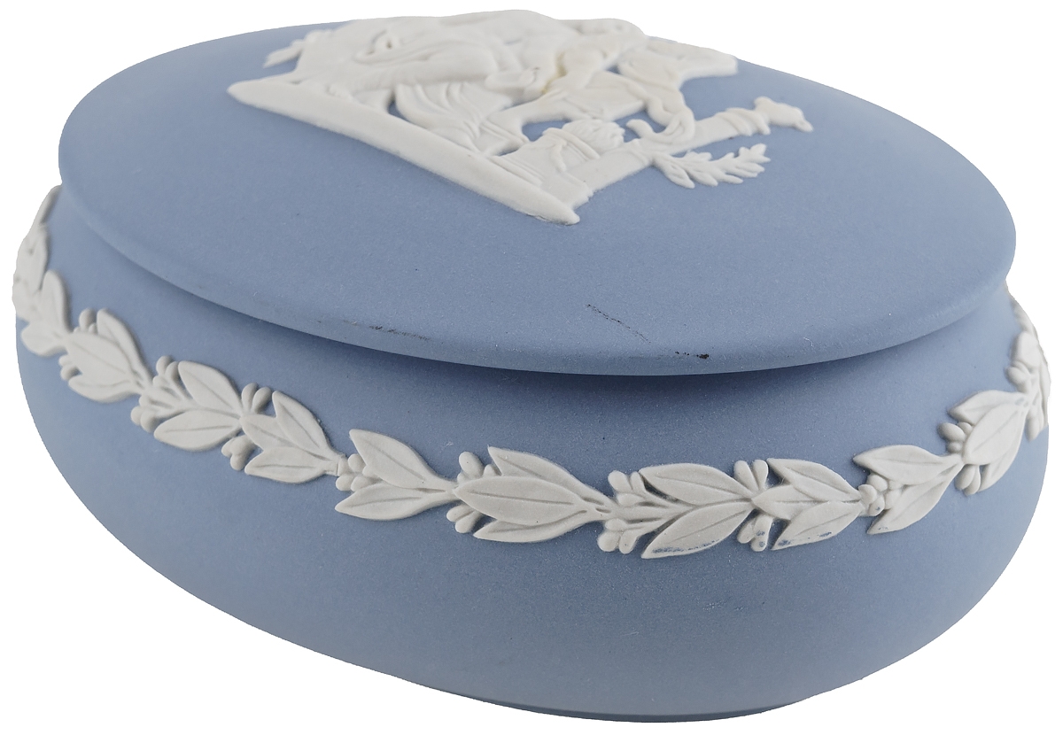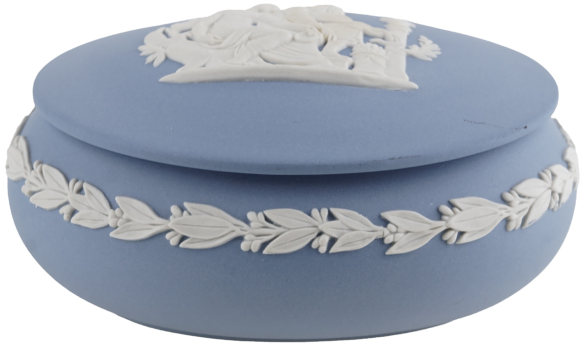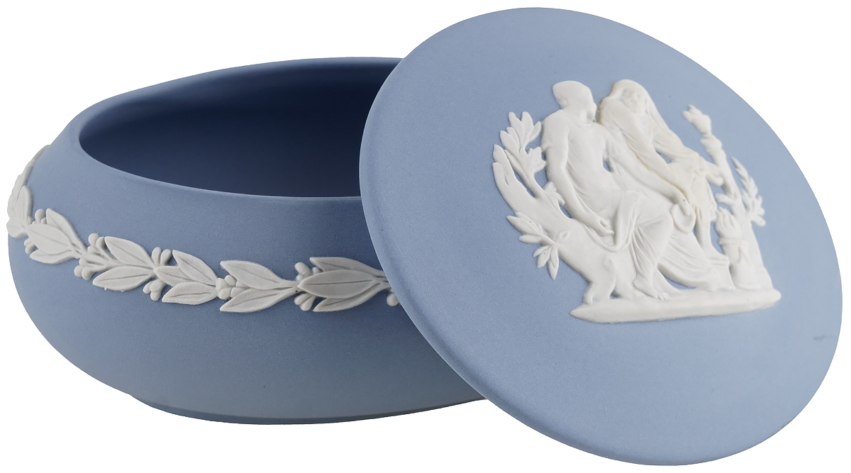 Шкатулка для мелочей украшена традиционным для Веджвуд рельефом белого цвета с античным сюжетом.