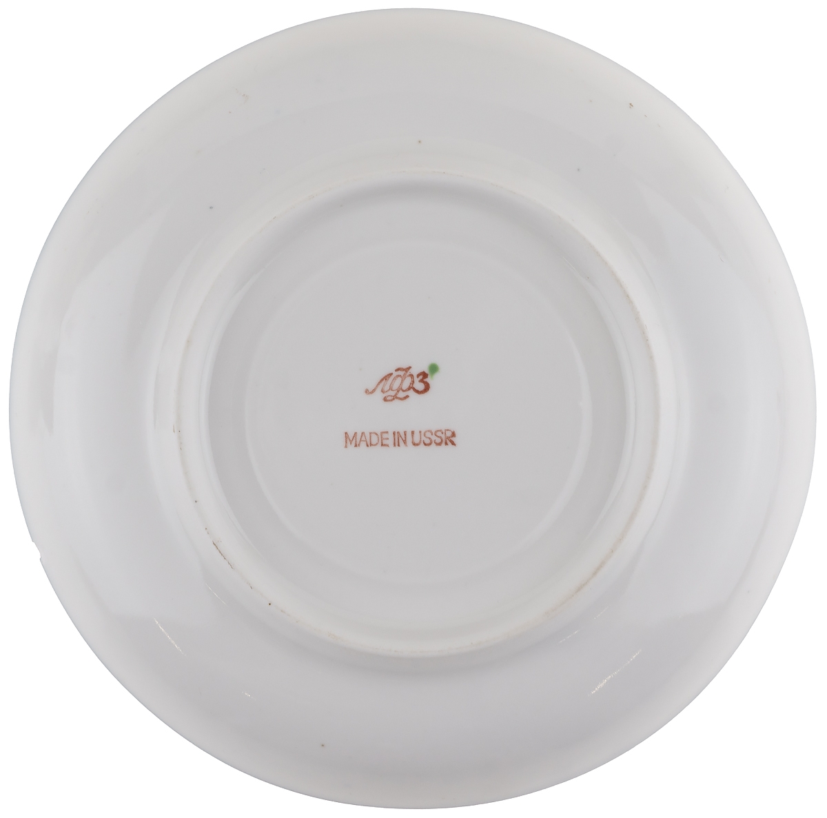 Сохранность хорошая, скол на блюдце снизу, пятно золотой краски снаужи на теле чашки, небольшие потертости на блюдце.