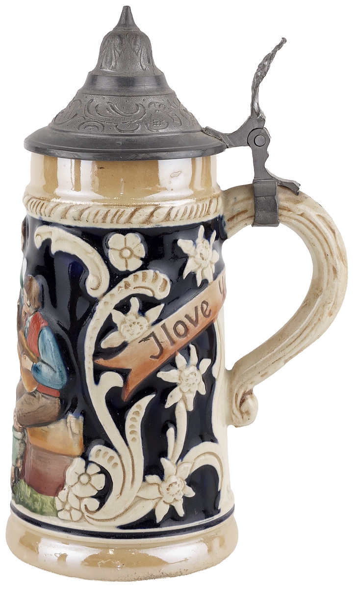 Кружка пивная коллекционная "Я действительно тебя люблю", с крышкой. Керамика, высота 16,5 см. Германия, винтаж, середина 20 века