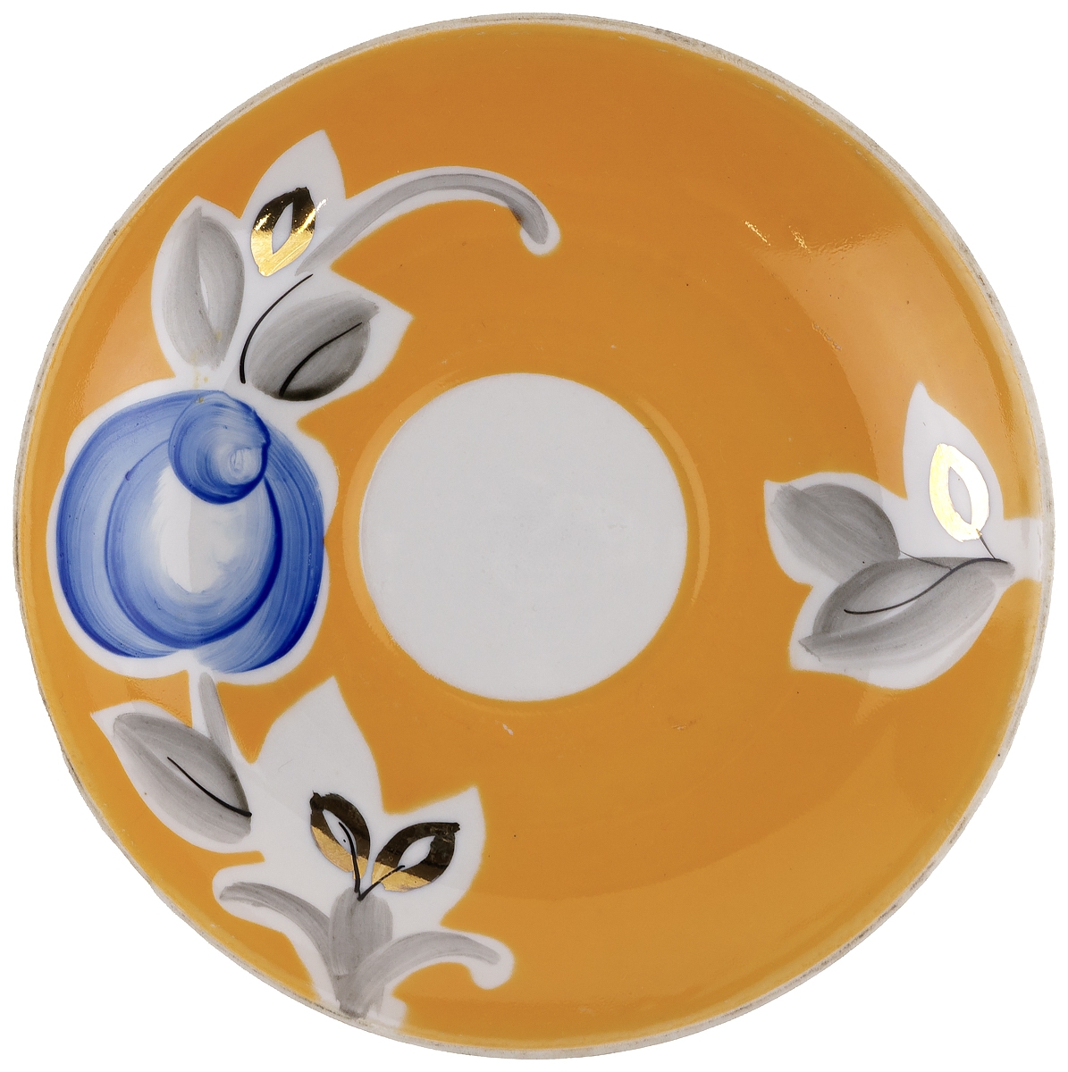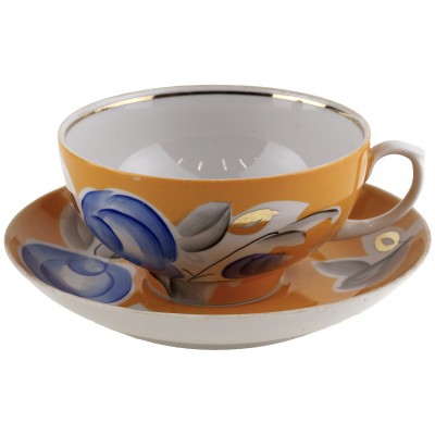 Чайная пара "Синяя роза на оранжевом", фарфор, винтаж, агашки, Дулево, СССР, вторая половина 20 века