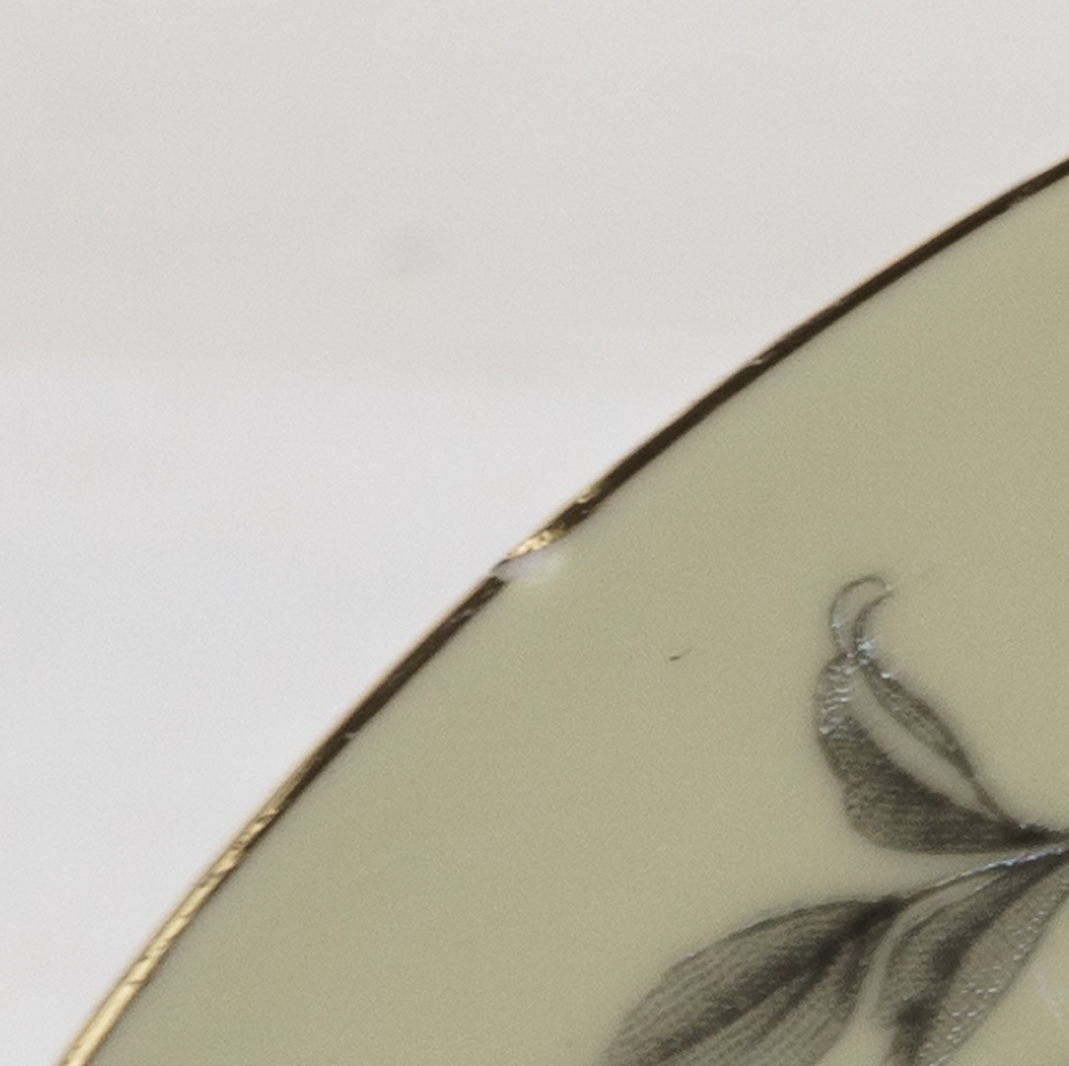 Сохранность хорошая. Золочение в хорошей сохранности для своего возраста. Внутри чашки маленькая точка - нюанс обжига и малозаметный мазок краски. На блюдце и десертной тарелке практически незаметный наплыв глазури. Микроскол по краю десертной тарелки.