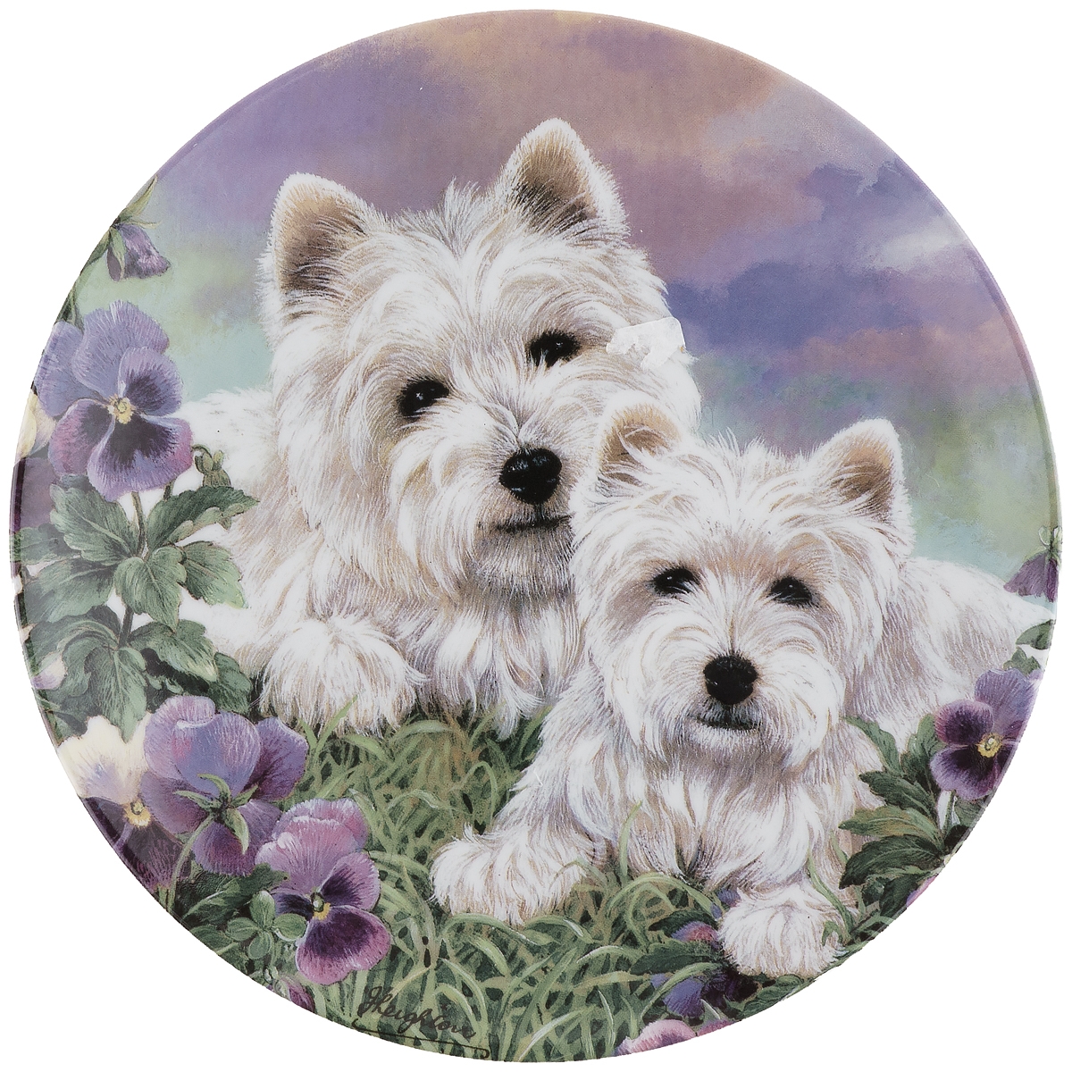 Настенная декоративная тарелка "Материнская любовь. Вестхайлендский терьер". Выполнена по рисункам художника Джейми Лейтона. Серия тарелок с собаками "Семья Вести".