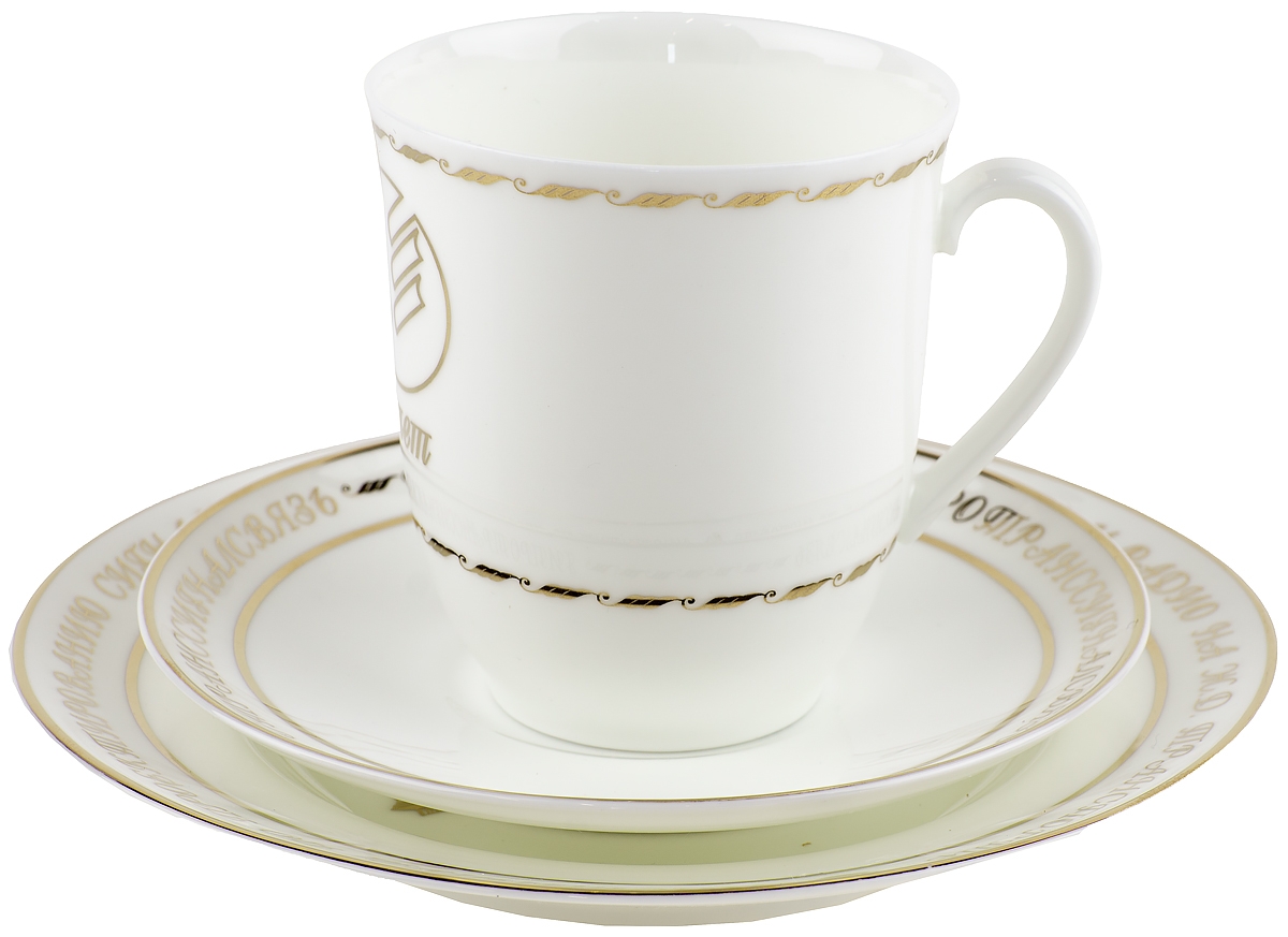 Коллекционное чайное трио "Гипротранссвязь" из костяного фарфора. Чашка небольшого объема, может использоваться для чая или для кофе.