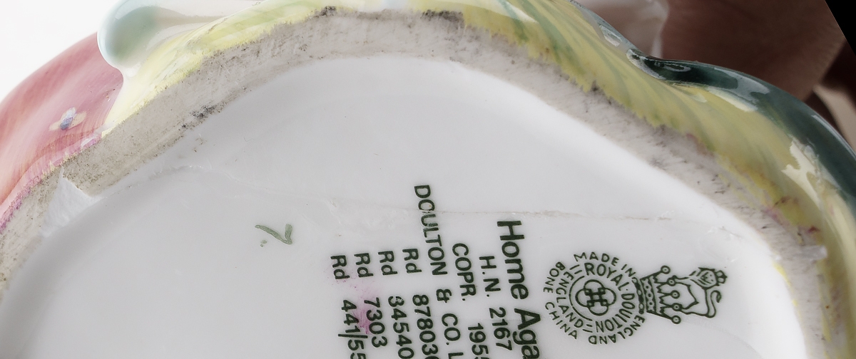 Маркировка: подглазурное клеймо оливкового цвета "Royal Doulton. Bone china. Hand made and hand decorated. Design in England".