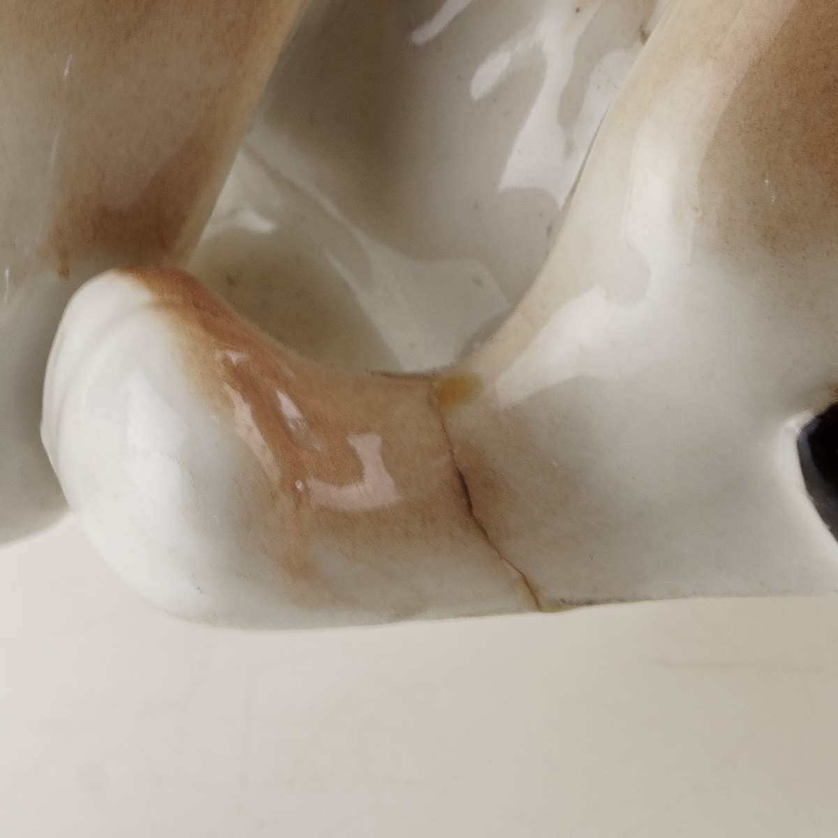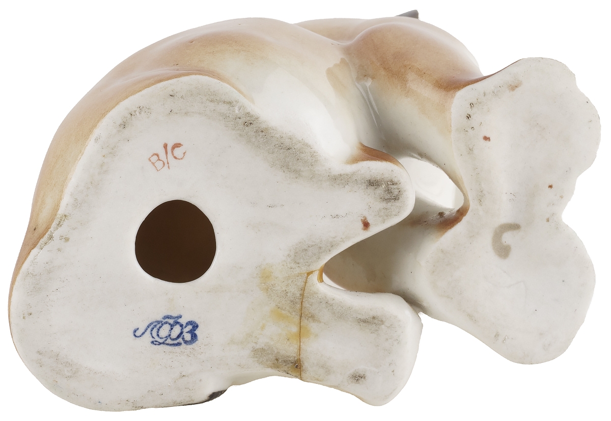 Сохранность хорошая, реставрация задней лапки, видны следы склейки.
