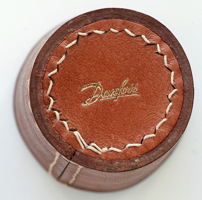 Набор для игры в кости: кости, кожаный стакан, брошюра с описание игр в кости. Danfoss, Великобритания, 1950-е годы