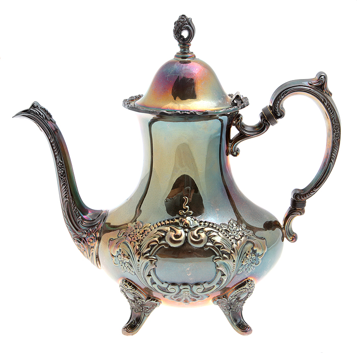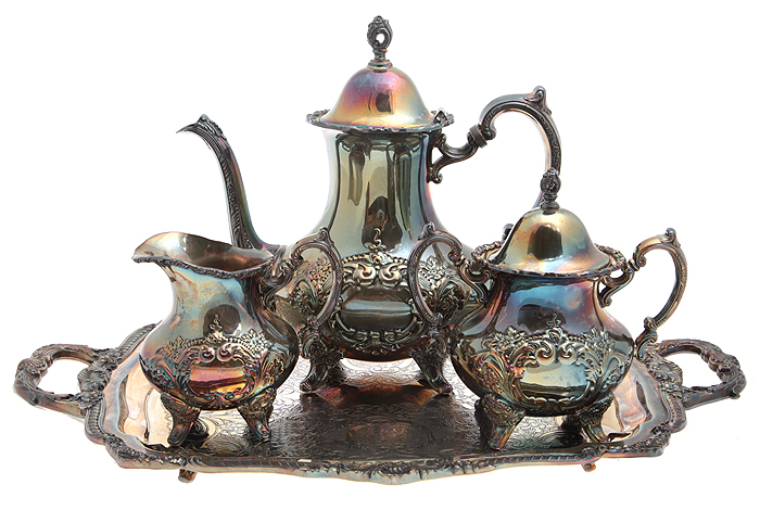 Богато украшенный чеканкой старинный набор для сервировки чая из 4 предметов: сахарница, молочник, чайник, поднос.