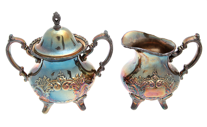 Чайный набор из 4 предметов: сахарница, молочник, чайник, поднос. Металл, глубокое серебрение, чеканка. Poole, США, 1920-е гг.