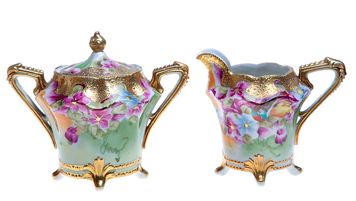 Nippon конца 19 века. Раритет. Сливочник и сахарница "Лилии". Фарфор, ручная роспись в технике "мориаж", покрытие золотой эмалью 18 К. Nippon, Япония, конец ХIХ века