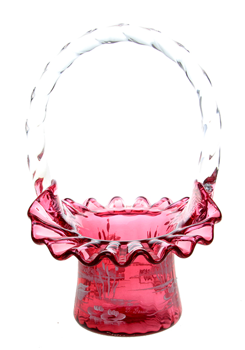 Fenton. Конфетница "Лебеди", авторская работа. Стекло клюквенного цвета , цветные эмали, ручная работа. Fenton, США, 1996 год