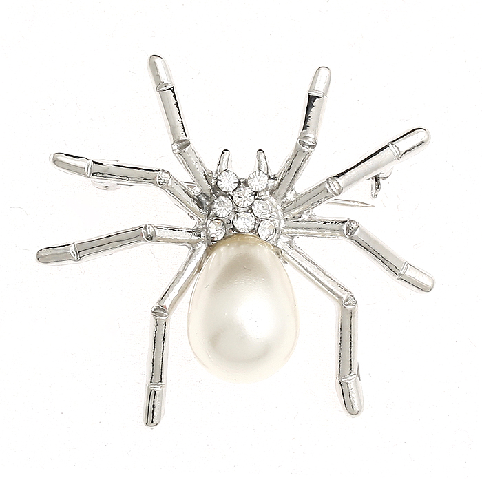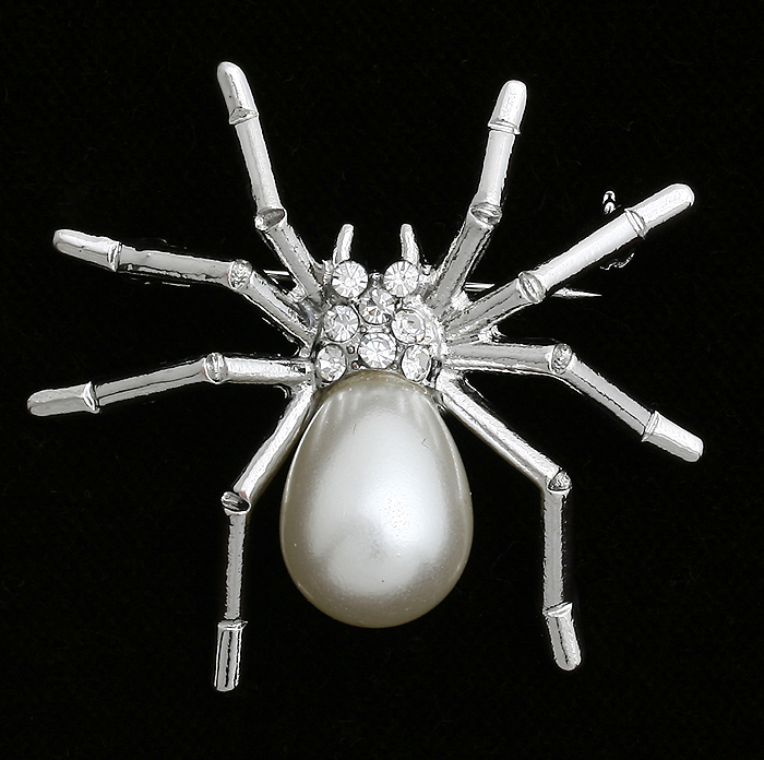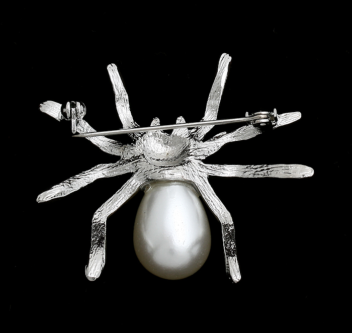 Брошь "Паук с жемчужиной". Прозрачные стразы, искусственная жемчужина, бижутерный сплав серебряного тона. Гонконг, 2005