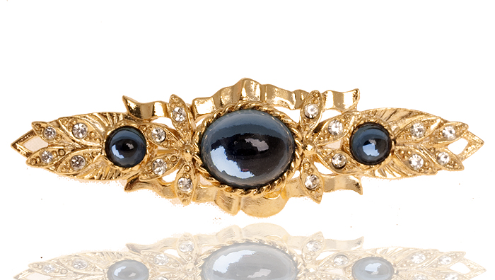Брошь "Лилит". Кристаллы сапфирового цвета огранки "кабошон", стразы, бижутерный сплав золотого тона. Специально для "LeCadeau", Франция, 1990-е годы