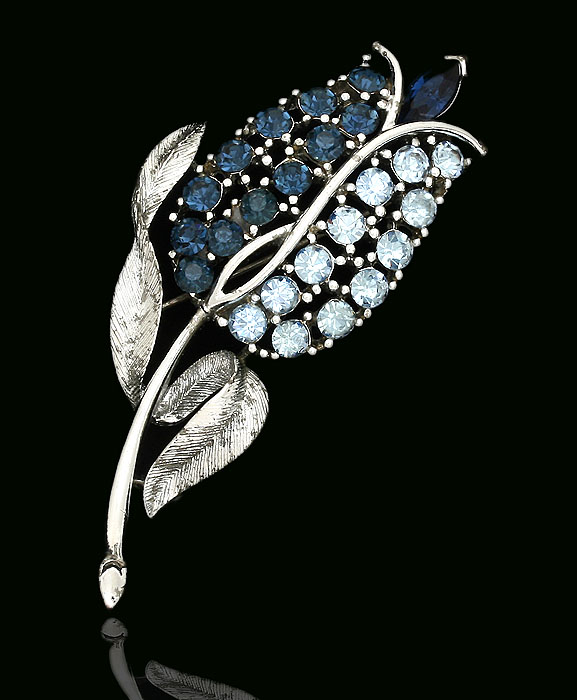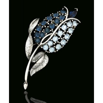 Брошь "Сапфировый тюльпан" от Lisner. Кристаллы сапфирового и голубого цвета, бижутерный сплав серебряного тона. США, 1960-е гг.
