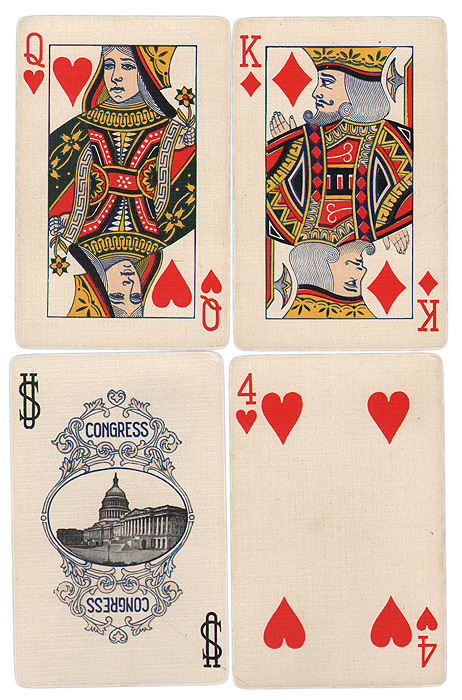 Игральные карты "Congress 606", 55 листов с 2 Джокерами, 1 картой Гарантии и 1 пустой картой. США, 1927 годкод товара 89нет в наличииГод: 1927Вес: 85 грподелиться