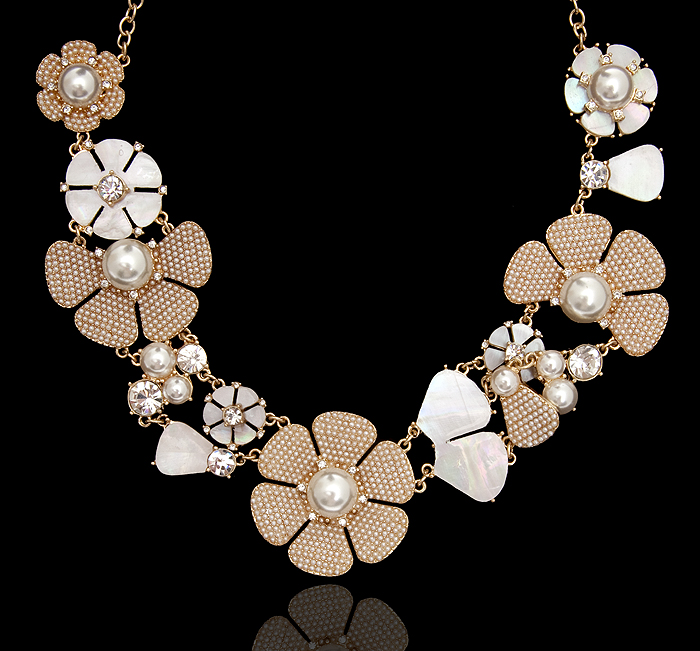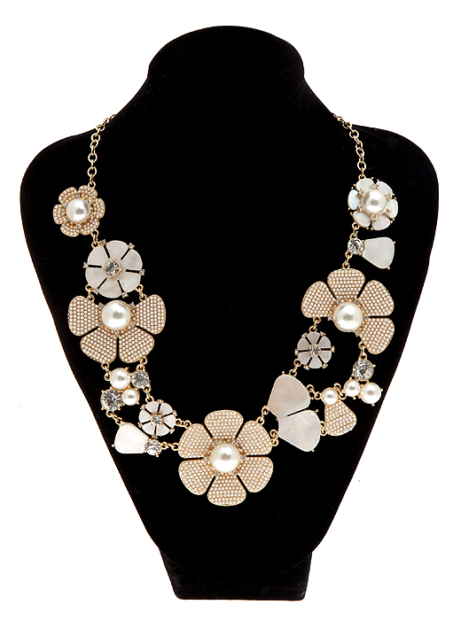 Ожерелье "Белые цветы" от Arrina. Искусственный жемчуг, перламутр, прозрачные кристаллы и стразы, бижутерный сплав золотого тона. Гонконг, 2000-е гг.