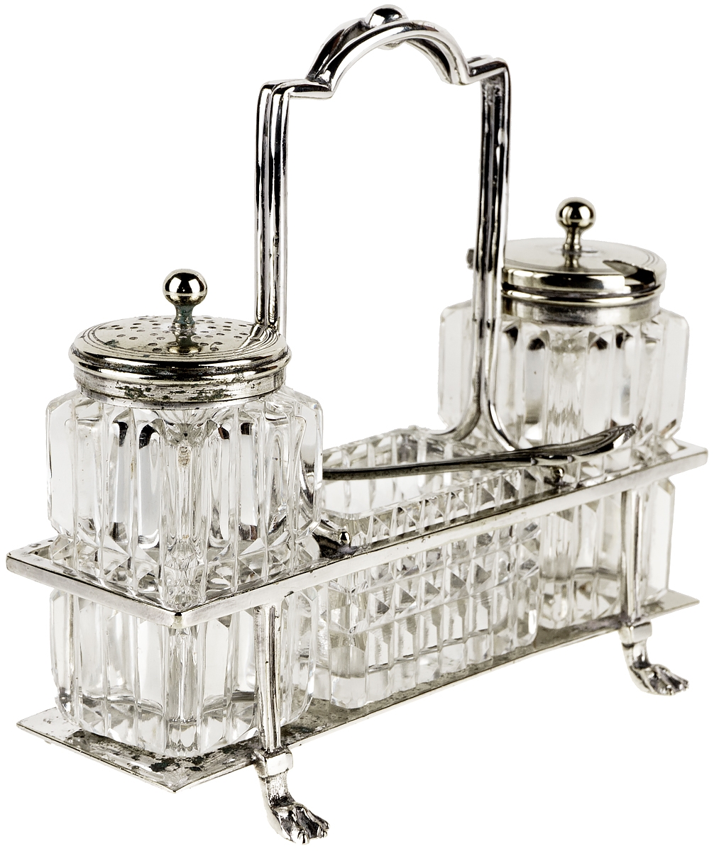 Набор для специй на подставке из 3-х предметов. Стекло, металл. Великобритания, первая половина 20 века