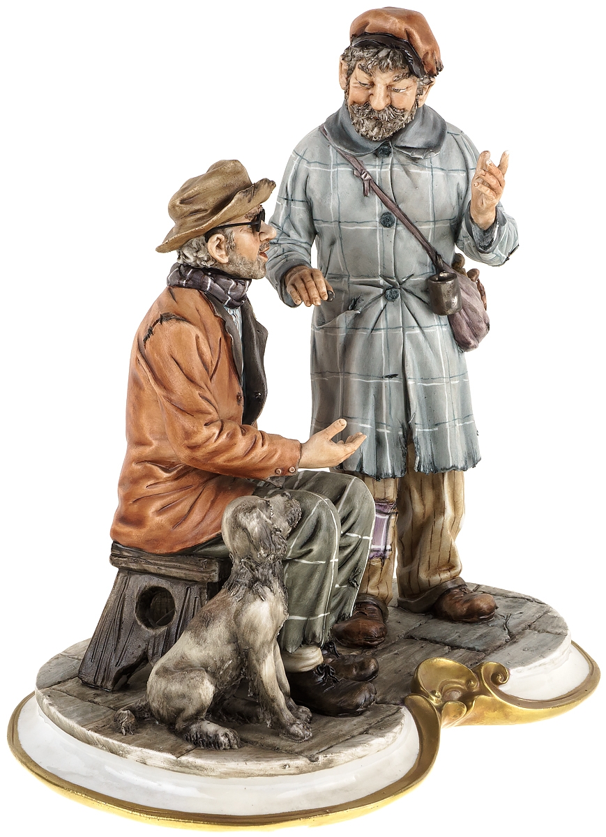 Великолепная жанровая статуэтка "По-братски" знаменитой неаполитанской фабрики фарфора Capodimonte. Этот коллекционный фарфор, отличает точайшая проработка мелких деталей и повышенное внимание авторов к жесту, позе и выражению лица персонажей.