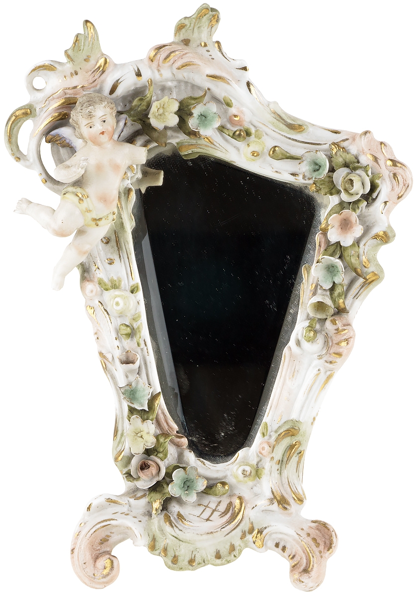 Зеркало настольное дамское антикварное "Путти" в фарфоровой раме. Есть крепление для подвеса на стену
