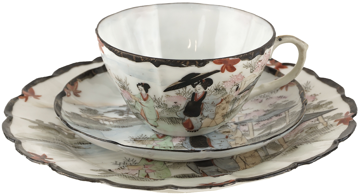Чайное трио, тройка "Гейши у реки", чашка с блюдцем и десертная тарелка, фарфор, ручная роспись, Япония, середина 20 века